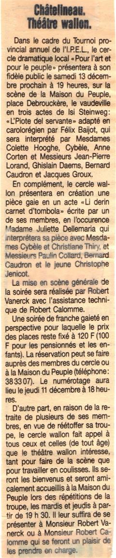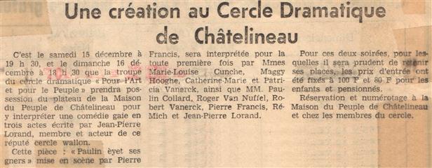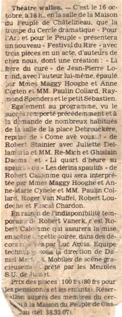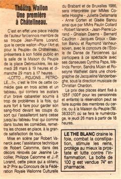 Mon rêve étant ado était d'être un artiste, je suis allé au solfège j'ai appris le piano, le saxo, mais j'aurai voulu faire du cinéma du théâtre, les possibilités dans ce domaine à l'époque était mince en Belgique. Un jour un client monsieur Robert Vanerck pour ne pas le cité étant régisseur au cercle (Pour l'Art et pour le Peuple) de Châtelineau m'a proposé de rejoindre sa troupe de théâtre wallon, j'ai commencé à jouer dans quelques pièces et très vite j'ai commencé à écrire des pièces. La toute première (Paulin èyèt ses gniêrs) eu un tel succès que la RTBF en a fait une captation. Je dois remercier aussi monsieur Emile Lempereur qui m'encouragea dans mon désir d'écrire, et André Gevret réalisateur qui a cru en moi. Je vous propose ici la liste de mes pièces en français, en wallon carolo, en différent dialecte de nos régions, en néerlandais et anglais pour certaines. ( Attention, ils sont tous en version pdf )